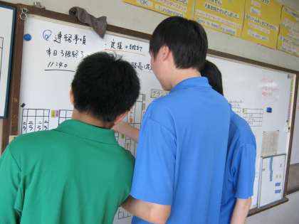 写真上:2年生に3年生がレクチャーしているところを
