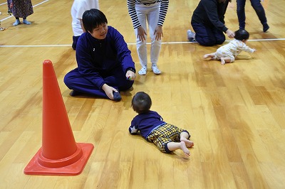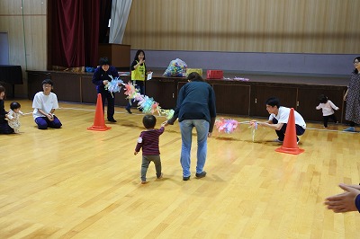 各競技で,スタートコールや障害物を持ったり,玉入れのカゴを持ったりとそれぞれ役割を担いました。乳幼児さんの様子にあわせてフラフープを動かしたり,カゴを近づけたり,臨機応変に対応していました。