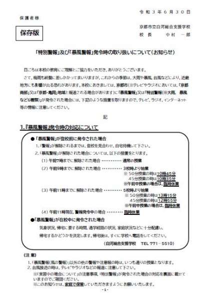 『「特別警報」及び「暴風警報」発令時の登下校の取り扱いについて(お知らせ)』
