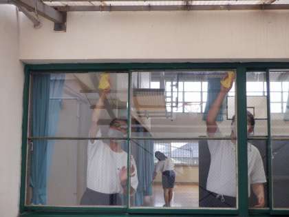 1年生は清掃演習で働くことの基礎基本を学んでいます。現在は自在箒や塵取りの使い方や雑巾の絞り方,窓の拭き方などを校内で実践しています。