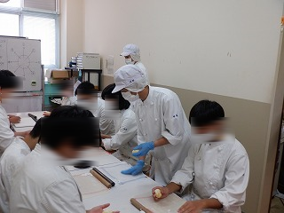 手洗いをしっかりした後,コックコートに着替え,パン生地を伸ばしました。