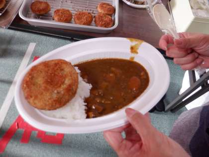 当日はカレーだけでなく、ジャガイモのコロッケも。ホテルのシェフ(ボランティア)が作られたコロッケは、とてもおいしそうでした。おいしいカレーとコロッケにみんなの笑顔が満開でした。