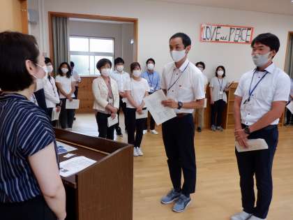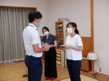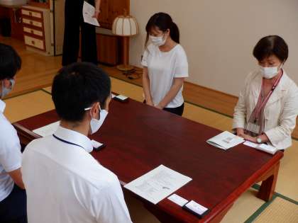 7月28日に京都ジョブパークから講師の先生を招いて,教職員のマナー研修を行いました。名刺交換の仕方や,応接室でのマナーなど,実際の場を想定した実践を行いながら進めていただきました。