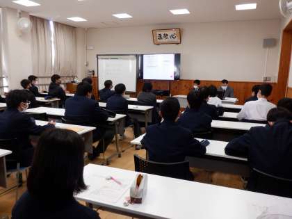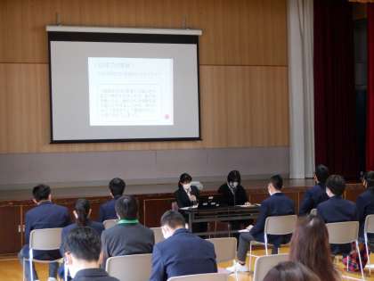 この4月から「働く社会人」として活躍されている3名の先輩とその保護者様をお招きして、在学中の体験実習や進路が決まるまでの経験,就労後の働く生活の現状について,お話をしていただきました。身近な先輩からの言葉は、在校生の皆さんの心に響き届きました。