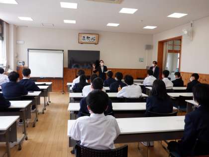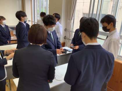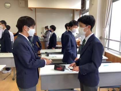 インターンシップ実習を控え,緊張しながらも真剣に名刺交換の練習をしていました。また,なぜビジネスマナーが必要なのかなどについても,それぞれが一生懸命に考えて発表する姿が見られました。