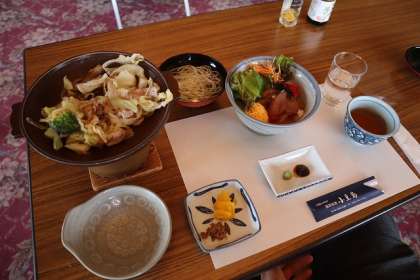 国民宿舎 小豆島で昼食です。「ひしお丼」「ローストビーフ丼」,事前に選んだメニューをいただきました。