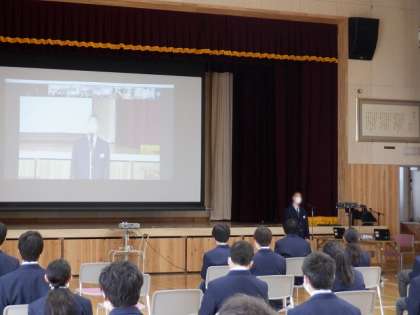 新入生歓迎会を開催しました。新入生は体育館に集まり,2・3年生は教室でライブ配信を見ながら参加しました。生徒会の進行により,1年生の自己紹介や,授業紹介,部活動紹介があり,スライドや映像を使って発表されました。1年生の自己紹介では,名前とともにこれから頑張りたいことや,やってみたいことなどの発表があり,それぞれの決意が込められた発表となりました。