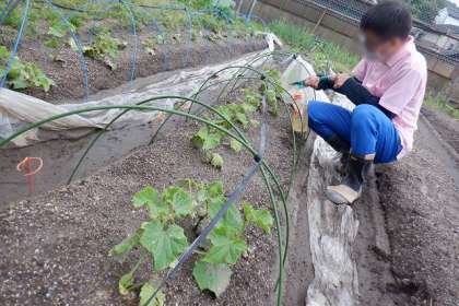 農園芸では、キュウリの苗に木酢液を散布しています。