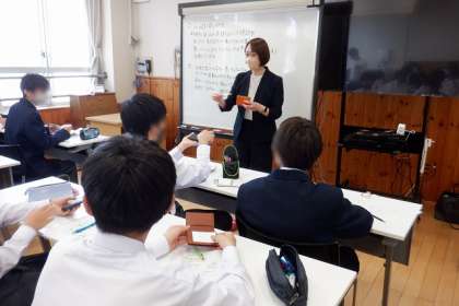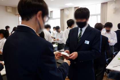 また、実際に自分の名刺を使って、生徒同士で名刺交換の練習をしました。