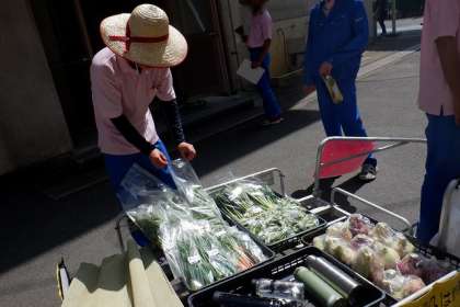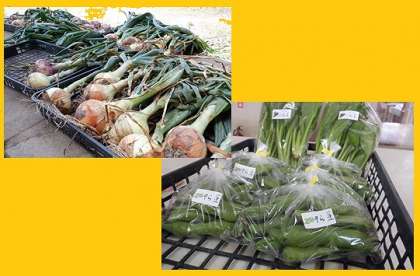 本日の引き売りは、そら豆、にんじん葉、玉ねぎ、実えんどう、スナップエンドウなどが並びました。