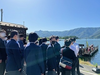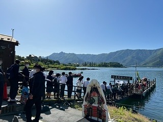 河口湖の到着しました。雲一つない空はとても青く、太陽の光が降り注ぐ河口湖も真っ青で、本当にきれいです。