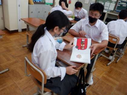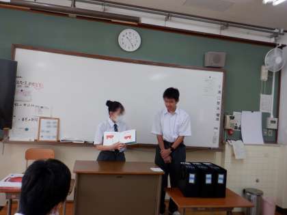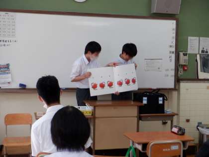 1年生『思考表現』の時間に、本の読み聞かせを行いました。目的は、相手に伝わりやすいように話すことです。抑揚をつけたり、話すスピードを変えたり、どうしたら相手に伝わりやすいかをまずグループで考え、練習しました。そして、読み聞かせという形で発表しました。