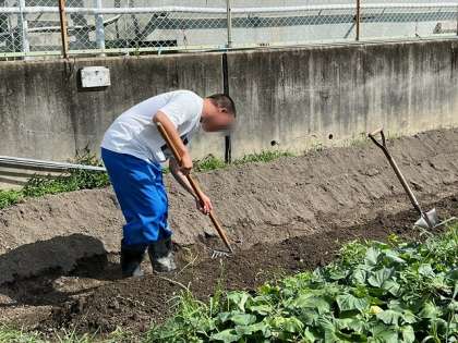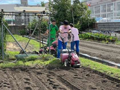今日は、七条農園での活動を紹介します。週3回程度、七条農園で作業をしています。耕運機を器用に操作して畑を耕したり、刈り払い機を使って除草作業をしたりしています。機械のメンテナンスも自分たちでしています。