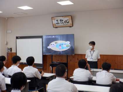 2年生を対象に非行防止教室を行いました。まずは、緊張をほぐすためのアイスブレーキングから始まりました。続いて、日常の出来事などを織り交ぜながら、生徒たちにわかりやすくお話していただき、真剣な眼差しで話を聞く姿が見られました。