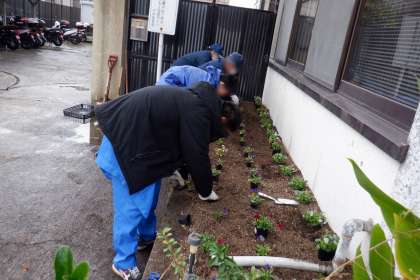 雑草をきれいにし、土を耕して、新しい花を植えました。雨が心配されましたが、天候もどんどん良くなり、花壇に新しく植えられた花を歓迎しているかのように、太陽も顔を出してくれました。とてもきれいな花壇に仕上がりました。
