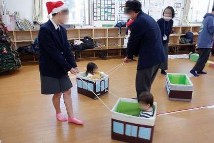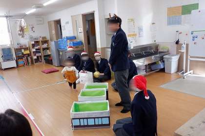 1日目は2,3歳の子どもたちと活動しました。始まるまでは緊張した面持ちの6名でしたが、自分たちの考えた乗り物やゲーム遊びで楽しんでいる様子を目の当たりにして、全員が自然と笑顔になりました。