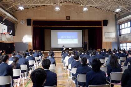 冬季休業が明け、今日から授業が再開されました。1時間目には、全校集会を行い、校長先生からは、辰年に因んで、「様々な関門(困難)を突破し(乗り越えて)、成長していく」という意味を表す『登竜門』のお話がありました。また、生徒会からは、『3年生を激励する会』の告知がありました。