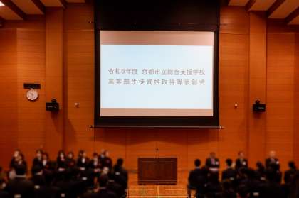 2月21日(水)に京都市総合教育センターに於いて、令和5年度京都市立総合支援学校高等部生徒資格取得等表彰式が行われ、本校からは7名の生徒が表彰を受けました。