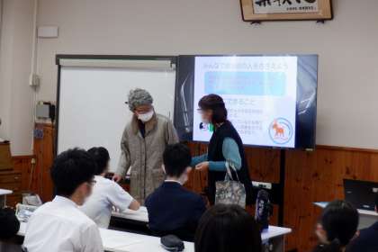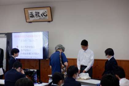 心得を教えていただいた後、認知症の方への悪い対応の寸劇を見て、認知症の方への対応について、どのようにすればいいかをグループで話し合いました。最後に話し合ったことを同じ場面を再現して確認しました。今後、困っている人に出会ったときは、今日学んだことを活かして対応していきたいと思います。