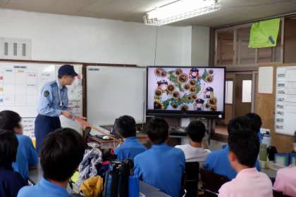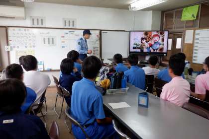 今日は、今年度1回目ということで、『ひまわりの絆プロジェクト』についてや、自転車の交通ルールについてのお話を聞きました。また、自転車が盗難にあわないように、大切なこと『2つの鍵をつけること』を教えていただきました。