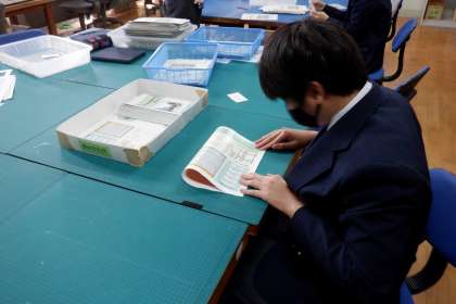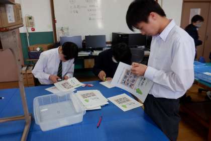 情報印刷では、5月19日(日)に予定されている学校説明会の資料作成を行っています。学校説明会では、保護者や学校関係者の方々に資料を配布するため、大変多くの部数が必要です。1つ1つ、資料がそろっているか、しっかりと留っているかなどを確認しながら作業を進めていました。きれいに冊子になっていないものは、もう一度やり直すなど、品質を保つように努力する姿が見られました。