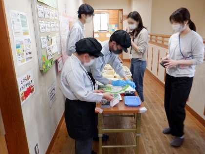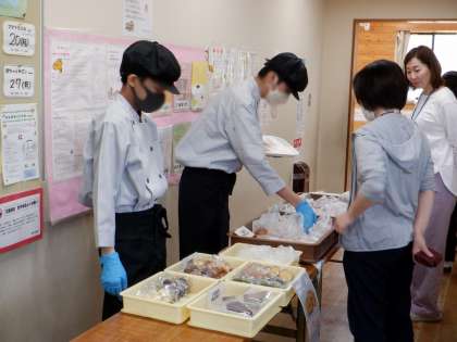 今日は、1年生2名と3年生1名で担当しました。1年生は校外での販売が初めてのため、緊張している様子が見られましたが、3年生の先輩にアドバイスをもたっらり、手伝ってもらったりしながら、頑張っていました。3年生は、2人の1年生の間に入って、様子を伺いながら、必要に応じて助言などをしていました。3人で力を合わせて販売活動を行うことができ、錦林児童館の利用者や職員の皆さんに喜んでもらうことができました。