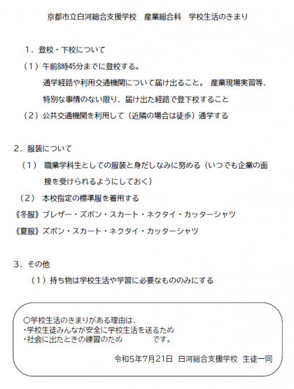 昨年度、生徒会本部役員とクラス委員が中心となり、本校の学校生活のきまりが「なぜ・何のためにあるのか」について考える機会を持ちました。そのときに話合った内容を載せた「学校生活のきまり」を掲載しますので、ご覧ください。