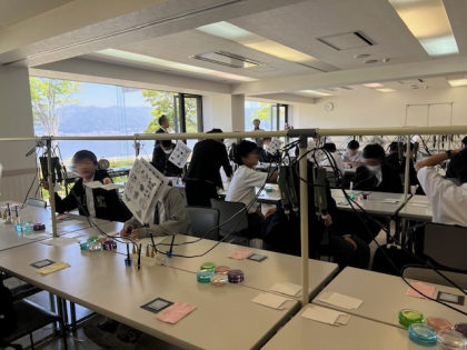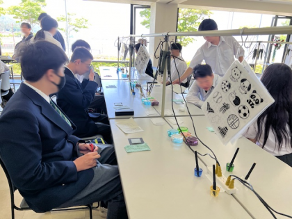 これから、ガラスの絵付け体験です。リューター(電動切削工具)でガラスを削って絵を描きます。