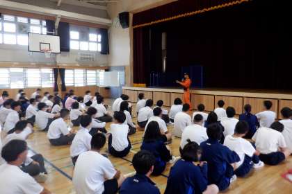 本日、6月14日(金)5時間目に避難訓練を行いました。地震が発生し、その後、北校舎食品加工室より、火災が発生したと想定して行いました。グラウンドへの避難の予定でしたが、暑さが大変厳しく、急遽、体育館への避難になりましたが、落ち着いて避難行動をとることができました。また、岡崎消防署より、消防士の方に訓練の様子を見て講評をいただきました。避難行動については、しっかりできていたと評価いただきました。火災の避難について、『炎は上の方が熱いこと、煙は上に上がることを踏まえ、横もしくは下に避難すること』と、教えていただきました。