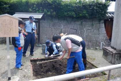 先日、大雨のため延期になった金塊光明寺での作業を本日行うことができました。今日は、まず除草作業からのスタートし、ひまわりが元気に育つように、土を耕しました。そして、川端警察署のお巡りさんと金塊光明寺のお坊さんと一緒に丁寧にひまわり🌻を植えました。