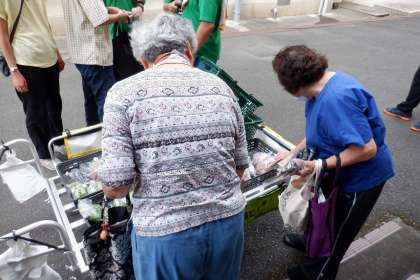 七条農園で育てているサツマイモを午前中に掘り起こして収穫しました。午後の引き売り販売で、サツマイモや芋づるを販売しました。初売りということで、お客様にも喜んでご購入いただきました。