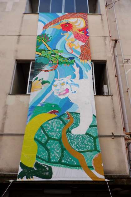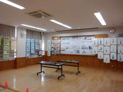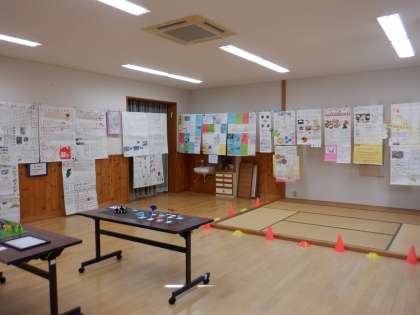展示発表では、それぞれの授業で学んだことや調べたことをまとめて掲示物を作り、掲示しました。また、『選択美術』の生徒が作成した作品を展示しています。本館校舎横には、『美術部』の大型作品を掲示してました。実習等が多くあり、まだ未完成ですが、美術部全員でテーマを決め、原案作って、6mの大きなキャンパスに下絵を描き、色付けをしている途中です。完成品は、11月に行われる作品展で展示される予定ですので、完成品を楽しみしていてください。