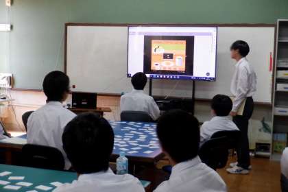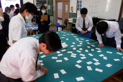 情報印刷では、タイピングや名刺の間違い探しをしました。タイピングは、タイピング練習アプリを使って行われ、まず、予選を行い、上位2名が決勝に進みました。決勝は、全員が見ている前で行われ、緊張感あふれる決勝戦でした。また、名刺の間違い探しでは、住所や名前、学年クラスの間違いだけでなく、商品とならない汚れを見つける難易度の高い設定となっており、生徒は夢中で間違いを探していました。