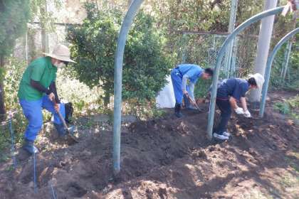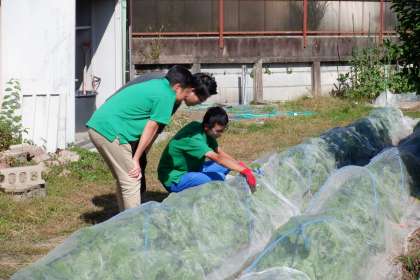 まずは、農園芸の活動や、今育てている野菜などについて説明をし、知ってもらいました。そのあと、グループに分かれて、追肥作業や畝作りなどの作業を一緒にしていただきました。