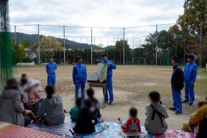 11月7日(木)午前中に、錦林児童館との交流農園活動を実施しました。今日は、サツマイモ掘りの作業を体験していただきました。乳幼児の皆さんに楽しんでもらえるよう、まずは、絵本の読み聞かせをしました。土に植わっている野菜の絵のページを開きながら『この野菜はなにかなー?』と問いかけ、『だいこんだよーん!』と仕掛け絵本のページ開くと、乳幼児の皆さんの目がキラキラしていました。