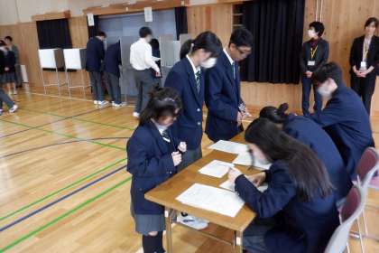 11月7日(木)5・6時間目に生徒会本部役員選挙を行いました。5時間目に立会演説会を行い、立候補者からは、なぜ立候補しようと思ったのか、当選したらどのようなことに力を入れて活動していきたいかなどの演説がありました。また、推薦人からは、立候補者とのエピソードなどを交えながら生徒会役員にふさわしい人物であることが伝えられました。6時間目には、投票を行いました。実際の選挙同様、受付で投票用紙を受け取り、記載台で記入して、投票用紙に投函しました。即日開票が行われ、結果は明日の朝のSHRにて報告させれる予定です。
