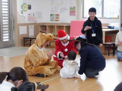 昨日に続き、この日は乳児のクラスの子どもたちと一緒に活動しました。人数も13名と昨日の倍近くなり、にぎやかな会となりましたが、生徒たちは昨日の経験から、子どもたちと自然にやり取りして笑顔が絶えませんでした。