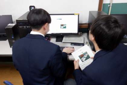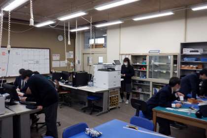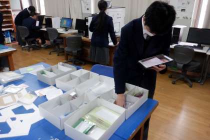 専門科『情報印刷』の授業を覗いてみると、いつものように、役割分担をして、任された仕事をそれぞれが責任もって行なう姿が見られました。名刺作成などの通常業務に加え、年度末ということで、商品の在庫確認を行ったり、名刺作成のマニュアルをアップデートしたりしていました。