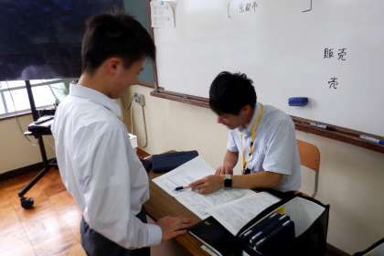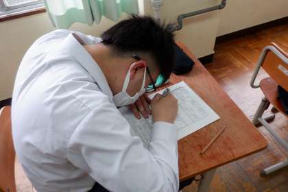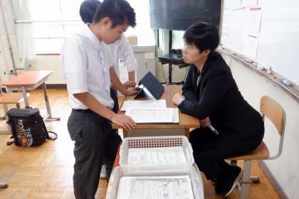 3年生の金曜日5・6時間目は、『職業生活』の授業です。教室を覗いてみると、真剣な眼差しで一生懸命に『求職申込書』を記入していました。まずは、下書きをして先生を一緒に確認していました。どのように書いたらいいかを先生や友達と相談しながら、一緒に考える姿が見られました。