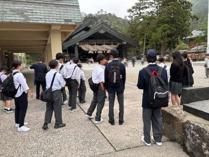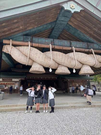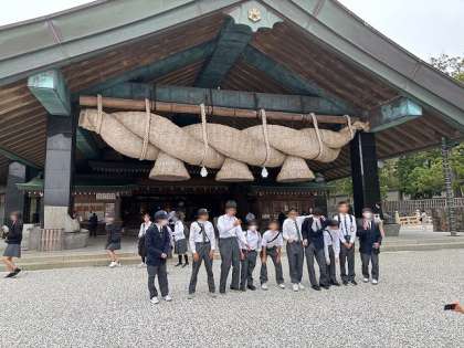 2日目の最終目的地、『出雲大社』に到着しました!まずは、みんなで参拝しました。大きなしめ縄がとても立派です。
