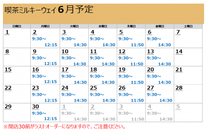 [6月]喫茶ミルキーウェイ営業カレンダー