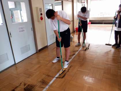今日は、1・3年生の教室をグループで協力して清掃しました。自在ぼうきの使い方を身につけるために、お茶の葉を利用して練習しました。友達と互いの姿を見合いながら、また、アドバイスし合いながら活動を進めていました。