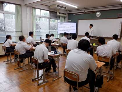 1年生『職業生活』の授業では、名刺交換の仕方について学習しました。今は、インターンシップ実習の最中ですが、インターンシップ実習が終わると、個人実習が始まります。実習の面接では、自分の名刺を手渡し、挨拶をします。これから何度も行う名刺交換に関するマナーやルールを一つ一つ確認しました。