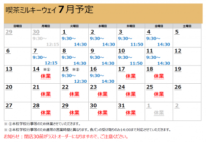 [7月]喫茶ミルキーウェイ営業カレンダー