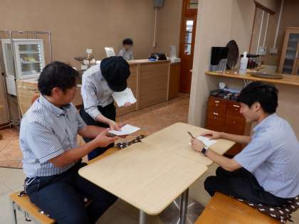3年生が流通・サービスの時間に、コーヒーの研究をしています。今日は、美味しいコーヒーの濃度を求めるために、コーヒーの試飲会を行いました。豆の量の違う2杯のコーヒーを飲み比べ、どちらが美味しいかを評価表にあるコク、苦みなどの項目ごとの点数を付けてもらいました。