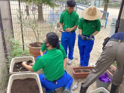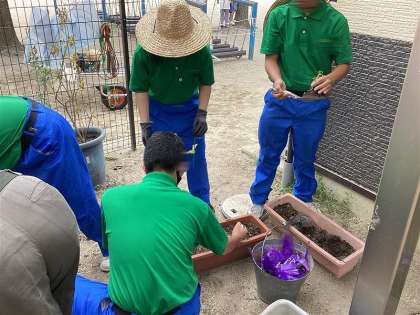 7月4日(金)に『ひまわりの絆PJ』の活動で、錦林児童館へ行きました。川端警察署の皆さんと一緒に錦林児童館のプランターにひまわりの苗を植え替える作業を行いました。大変蒸し暑い中の作業となりましたが、協力し合いながら作業することができました。