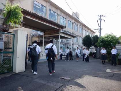 あいさつ週間中には、あいさつを啓発するために生徒会本部役員とクラス委員が校門で「おはようございます!」と元気にあいさつをしています。いつもと違う雰囲気に恥ずかしそうに挨拶しながら登校する生徒の姿の見られますが、元気な声が響き渡る校舎には活気が溢れています。