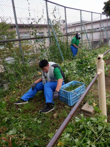 夏季休業中、手入れが行き届かなかった農園の整備を行っています。草刈りや草抜き、芋つるの整備(横に伸びていくので、広がらないようにします)など、役割を分担しながら作業を進めていました。