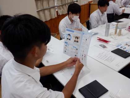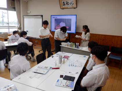 9月4日(木)5・6時間目に3年生が『身だしなみ講座』を受講しました。資生堂より2名お越しいただき、身だしなみを整えることの意味や大切さを教えていただきました。卒業後、社会人として、日頃から身だしなみを整えるための実践力を向上させるために、スキンケアの方法や髭の剃り方、髪型のセットの仕方、化粧の仕方などを教えていただきました。