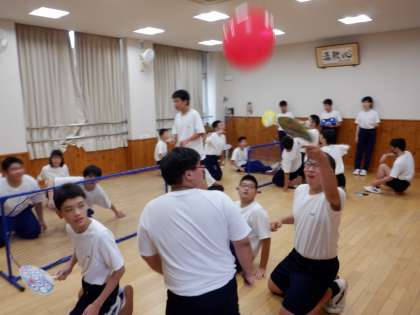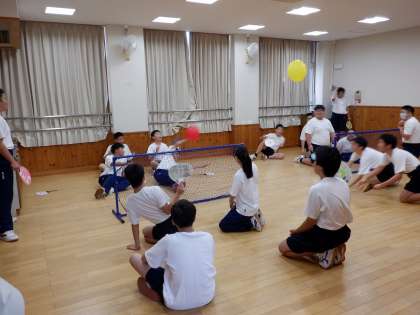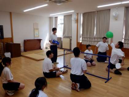 9月9日(火)も大変蒸し暑い1日となり、12時には暑さ指数が31度を超えました。体育館やグラウンドで活動するには、危険な暑さとなり、5・6時間目の保健体育は、冷房設備のある、ランチルーム・マルチルームでの活動となりました。狭い空間でも楽しく体を動かすことができるように、自分たちでルールを話し合って決めて、風船バレーの活動に取り組みました。手やラケット代わりのうちわで風船を打つだけでなく、うちわであおいで風をうまく利用してラリーをしていました。『座ってプレーする』というルールのもと、一生懸命、体を動かしたり伸ばしたりしながら風船を追いかける姿が見られました。